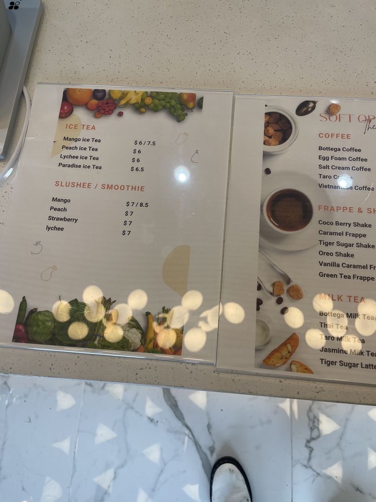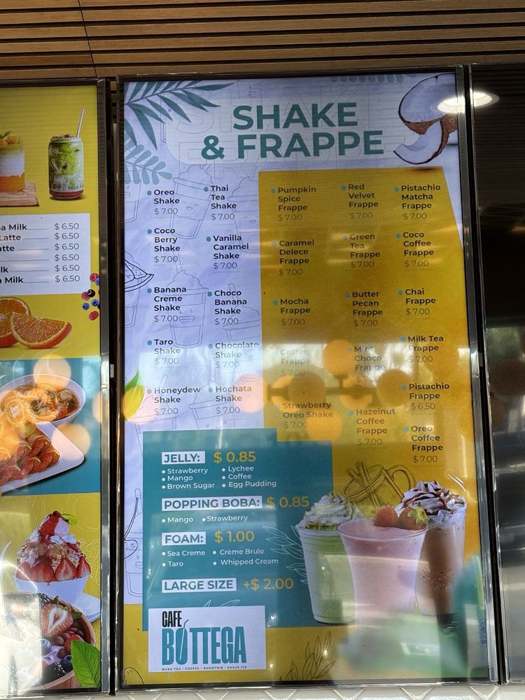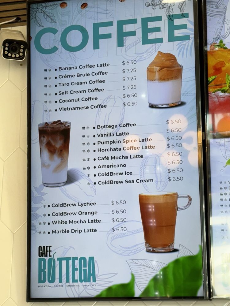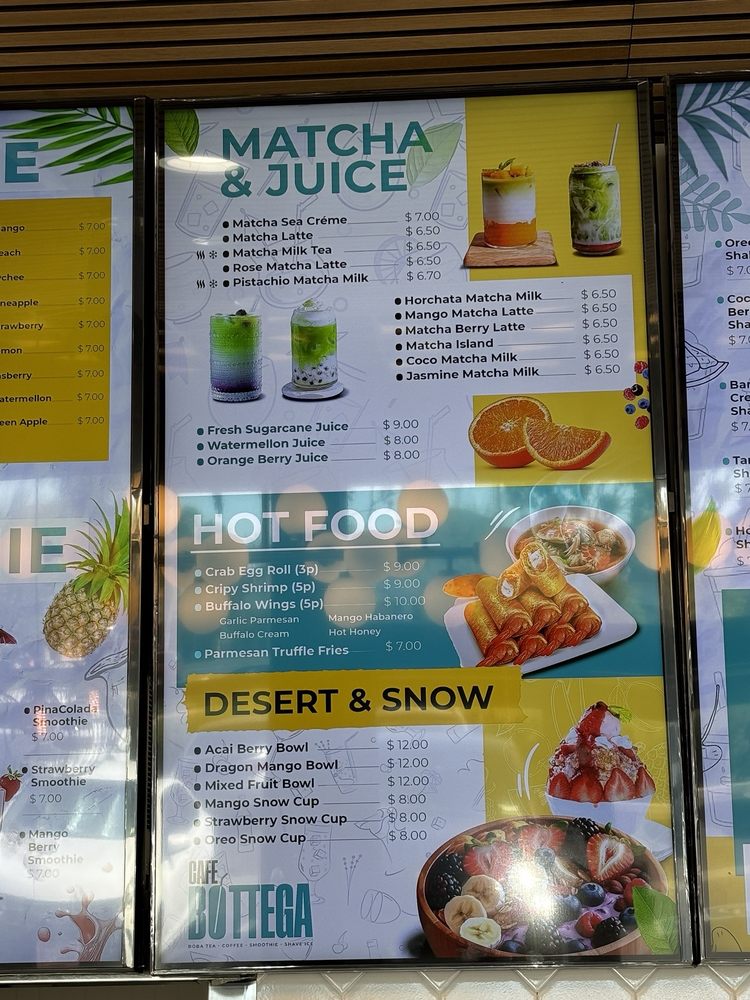 Cafe Bottega, located in Riverside, CA, serves a variety of bubble tea, coffee, and tea options. With its friendly and attentive staff, customers have praised the great customer service and welcoming atmosphere. The decor is noted for being pretty and clean, creating a pleasant dining experience. Standout menu items include the tiger milk tea with crème brûlée foam, as well as the vanilla caramel shake. The drinks are consistently delicious, and the selection ranges from classic favorites to innovative creations. The coco matcha and strawberry drinks are refreshing and not overly sweet, appealing to those looking for a unique twist on traditional flavors. Cafe Bottega offers outdoor seating options, making it a great spot to enjoy a drink and unwind. Overall, this cafe is a must-visit for quality beverages and a cozy ambiance.